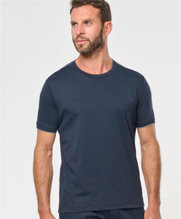 okrogel ovratni izrez z elastanom, tkan patent na rokavih, dvojni šivi na robu, kontrastni pasovi na ramenih rokavih, predhodna obdelava proti muckanju, trpežna in gladka tkanina, pralno na 60°, ni primerno za likanje, ni primerno za sušenje v sušilnem stroju, ni primerno za kemično čiščenje.