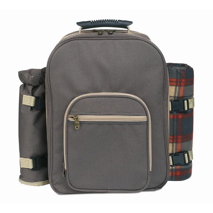 - Hochwertiger Picknick Rucksack für 4 Personen. Inklusive Decke, Flaschenfach und edlem Tischzubehör. 600D Polyester.
