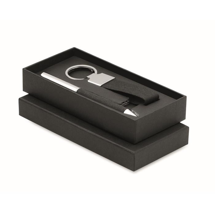 - Vključuje kovinski kemični svinčnik z detajlom iz RPET poliestra in obeskom za ključe iz RPET poliestra