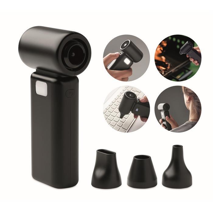 - Visoko zmogljiv ventilator. Prenosni turbo ventilator s 3 LED osvetlitvijo in 4 nastavitvami hitrosti vetra do 130000 vrt/min. Baterija 6000 mAh in hitrost vetra 23 m/s. To napravo lahko uporabljate kot čistilec prahu, puhalnik, ventilator ali sušilnik za lase.