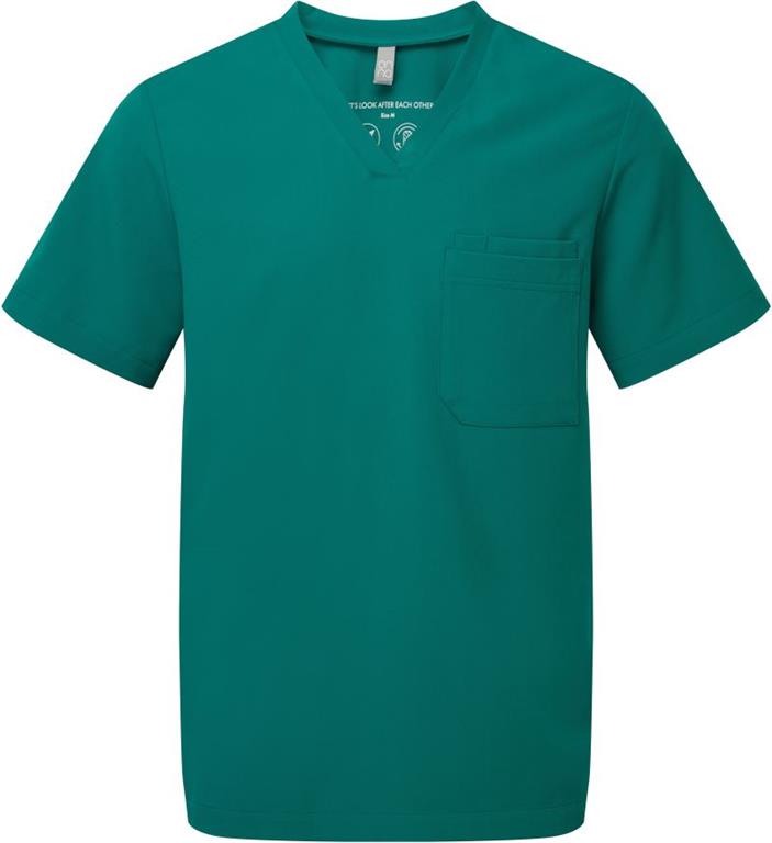 zračen material, V-izrez, levi žep na prsih, stranski razporki, 4-smerno raztegljiv material, trpežna tkanina odporna na mečkanje in enostavna za vzdrževanje, uravnava vlago, pralno na 40°, primerno za sušenje v sušilnem stroju pri nizki temperaturi, ni primerno za kemično čiščenje.