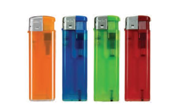 Plastični vžigalnik FROSTY U-59 v modri, jabolčno zeleni, oranžni in rdeči barvi.