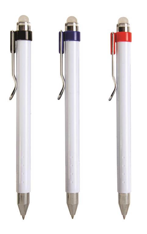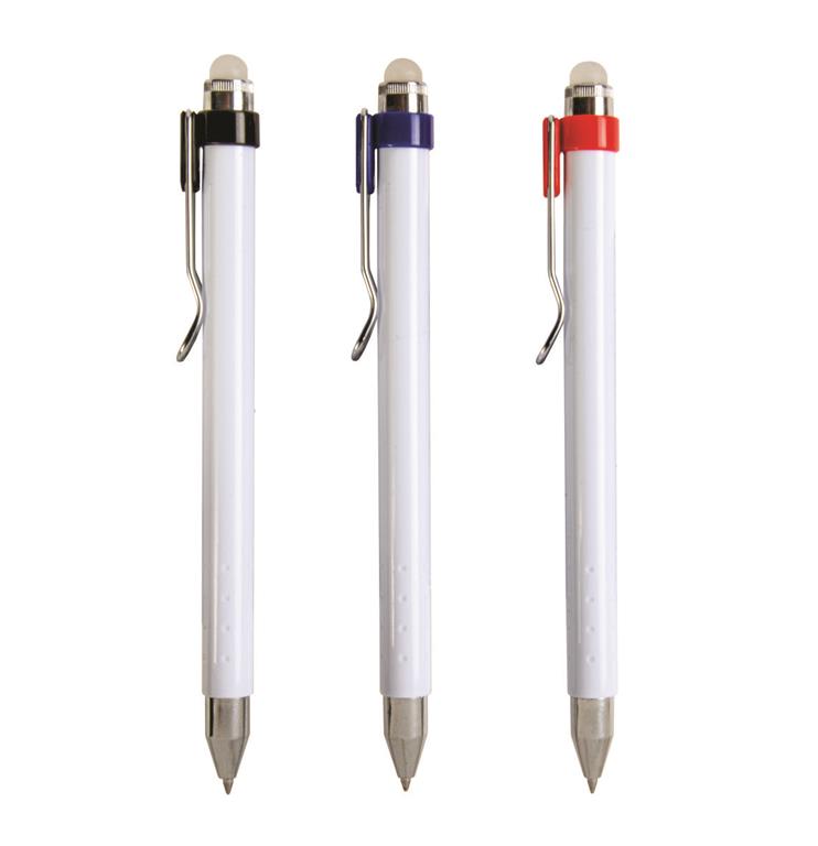 • Plastic push botton pen with eraseable ink, rubber and metal clip